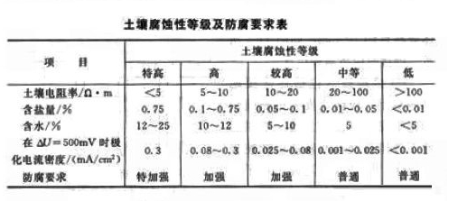 土壤腐蝕影響影響著土壤的電阻率,因此在選址時應適當考慮土壤腐蝕性與電阻率的關系,土壤腐蝕性等級及防腐要求如下表。